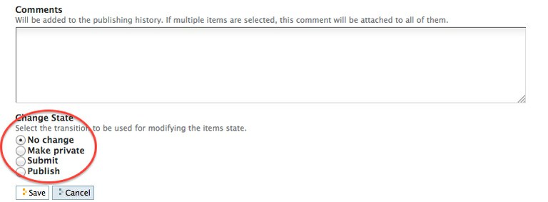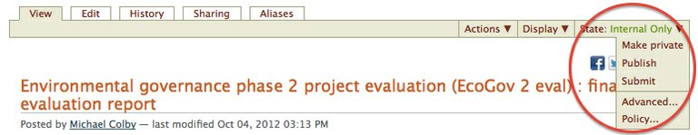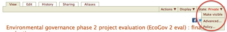 2. To publish content, i.e. to make publicly available for viewing, locate the state dropdown menu, and select publish.